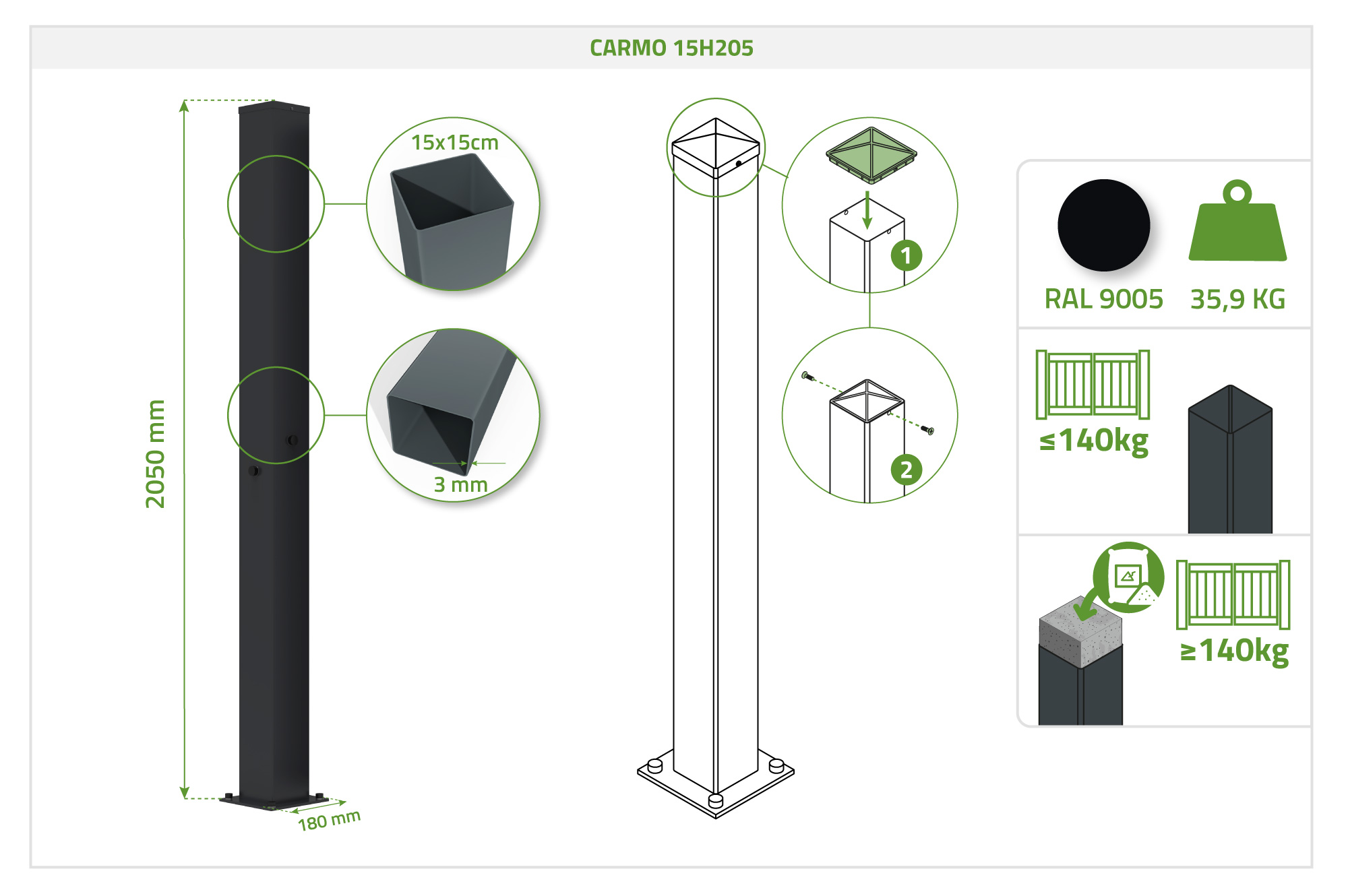 Questi pali in acciaio CARMO da 205 cm sono progettati per l'installazione di cancelli e barriere pedonali NALI alti 200 cm, garantendo un supporto affidabile e duraturo per le vostre installazioni esterne.